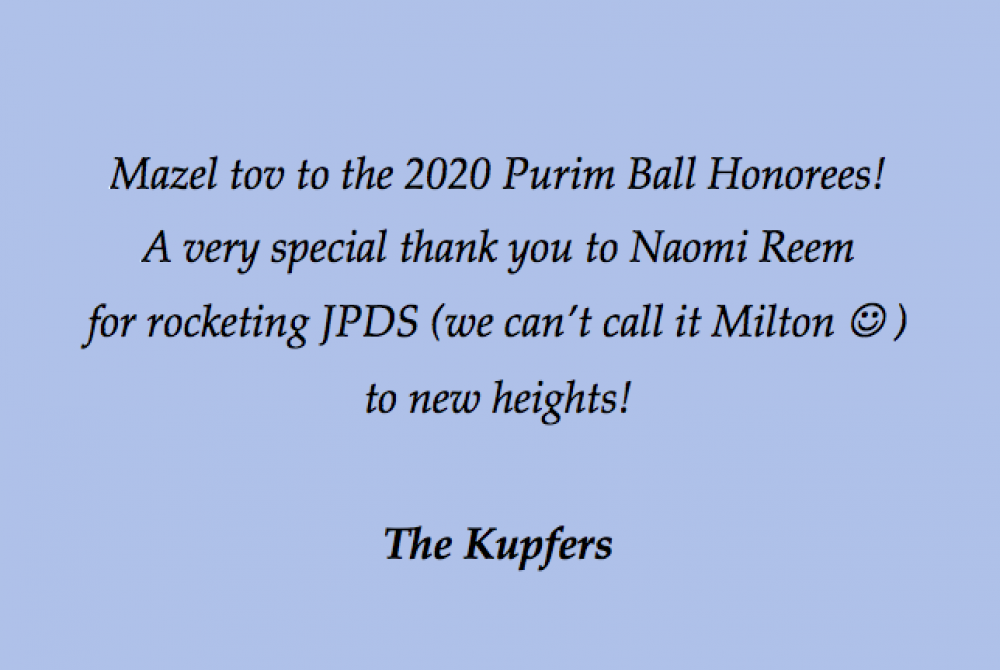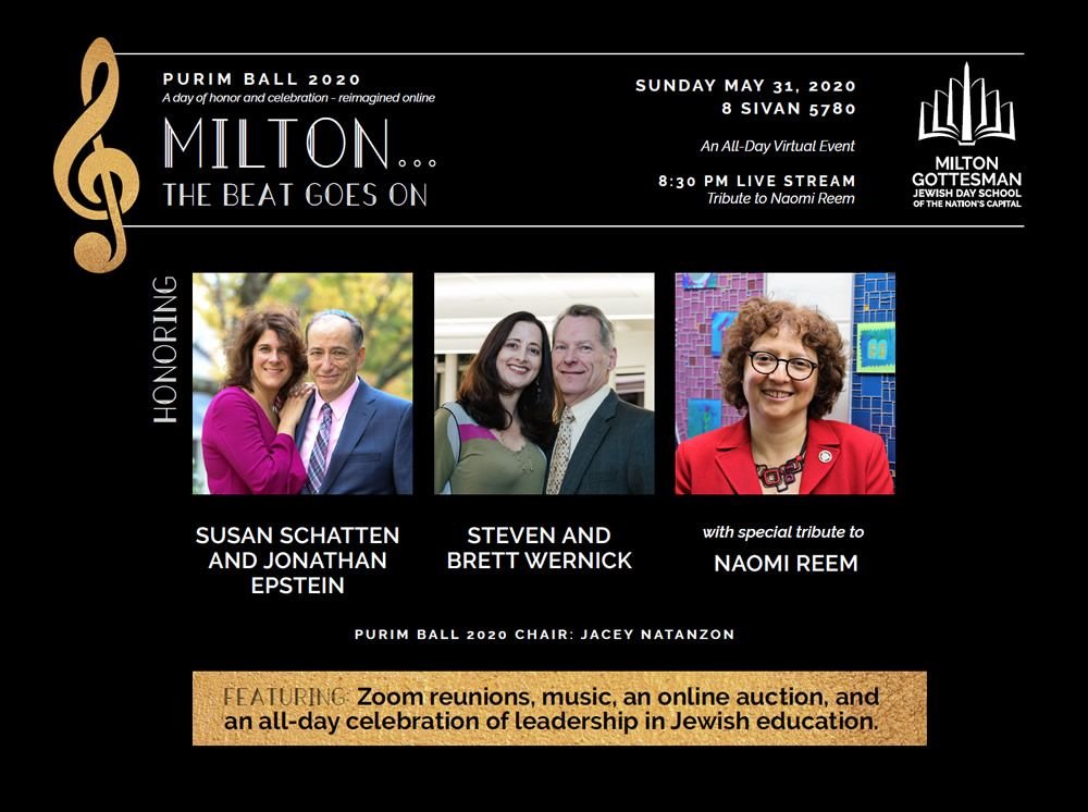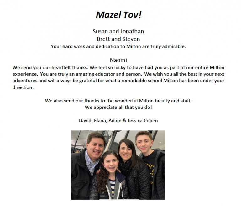 Mazel tov to all of the Purim Ball Honorees! The Milton Parents Association extends its thanks and appreciation for your partnership and many years of service. You have contributed so much and our vibrant community is a testament to your legacy. Susan, Jonathan, Steve, Brett and Naomi, we will miss you!