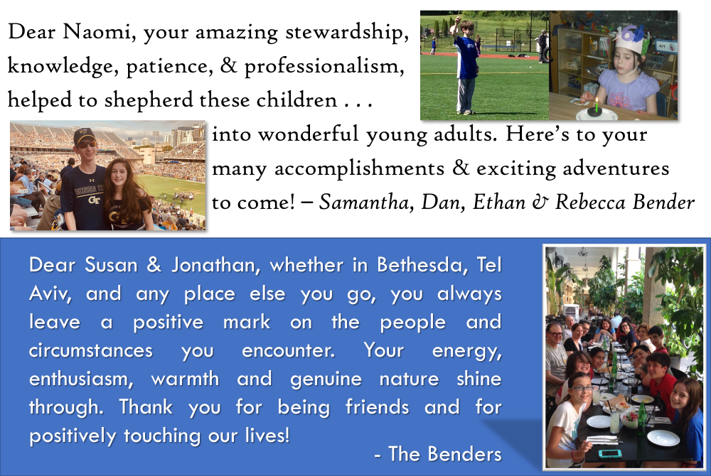 Thank you for an amazing year! You have taught us how to write thank you notes, delivered lessons on trust, resourcefulness, and communication. You've learned our strengths and individual needs, improved our math skills, given us a deeper understanding of key biblical figures, and shown us how to decode Biblical Hebrew You all make school fun, safe, and relevant. You challenge us to be kind every day in our actions and words. We are so grateful for your support, creativity, and devotion.