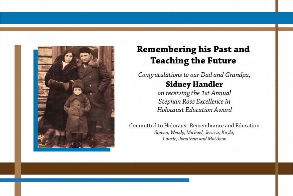 Congratulates Sidney Handler on receiving the Stephan Ross Excellence in Holocaust Education Award Leader