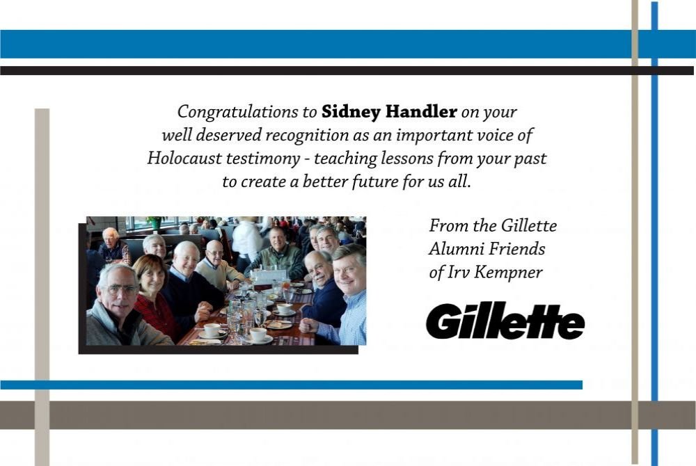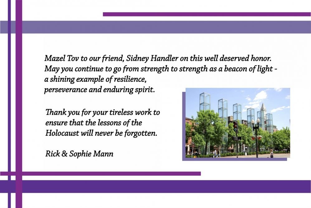 Thank you Sid Handler for all you have done and for inspiring us to keep the memory of the Holocaust alive. Michael and Beth Davis
