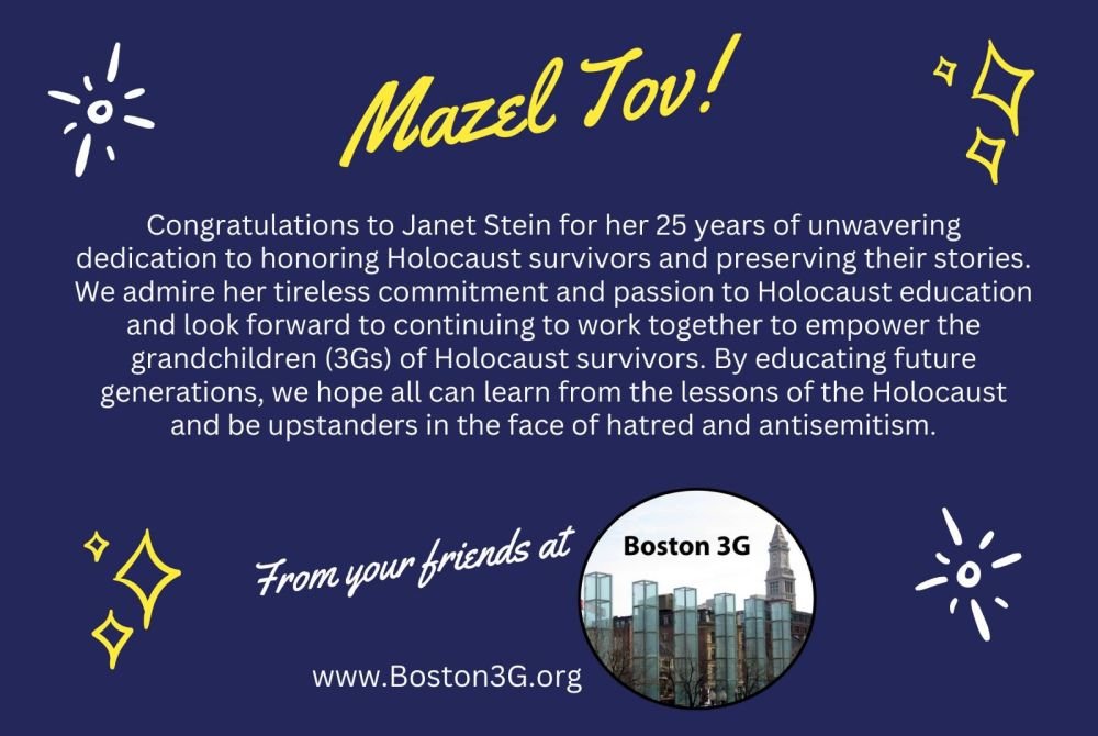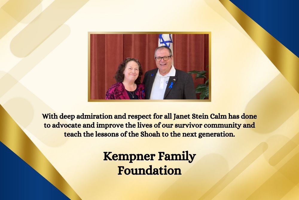 Janet Stein Calm for your tremendous dedication to the Survivor community and the transmission of history to the next generation. Mark and Beebe Goldstein