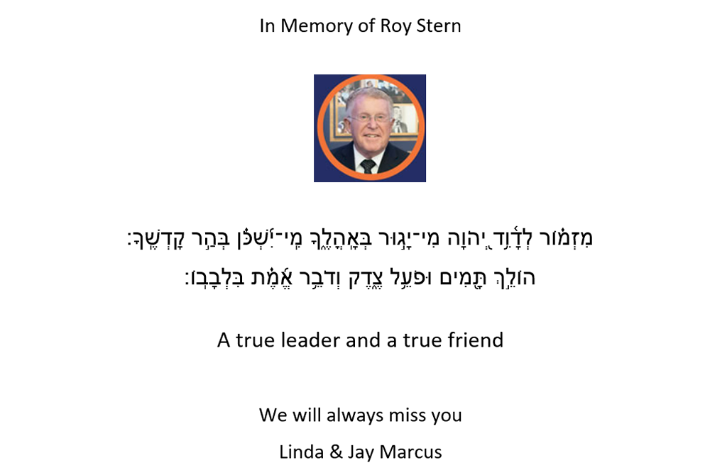 As a longtime Chairman of the Board of OTS Israel, Roy made an indelible impact on OTS and Jews worldwide. He was an extremely dedicated man of principles, guided by a commitment to excellence. He is deeply missed. Rabbi Kenneth Brander Rabbi Shlomo Riskin David Katz