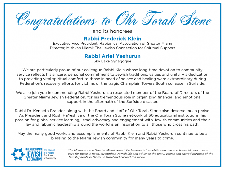 In honor and with gratitude we pay tribute to Rabbi Ariel Yeshurun For his service to the Skylake Synagogue, Miami, Florida And humanitarian efforts during the Surfside tragedy Thank you for being a model for all of us. Rabbi Dr. Kenneth Brander