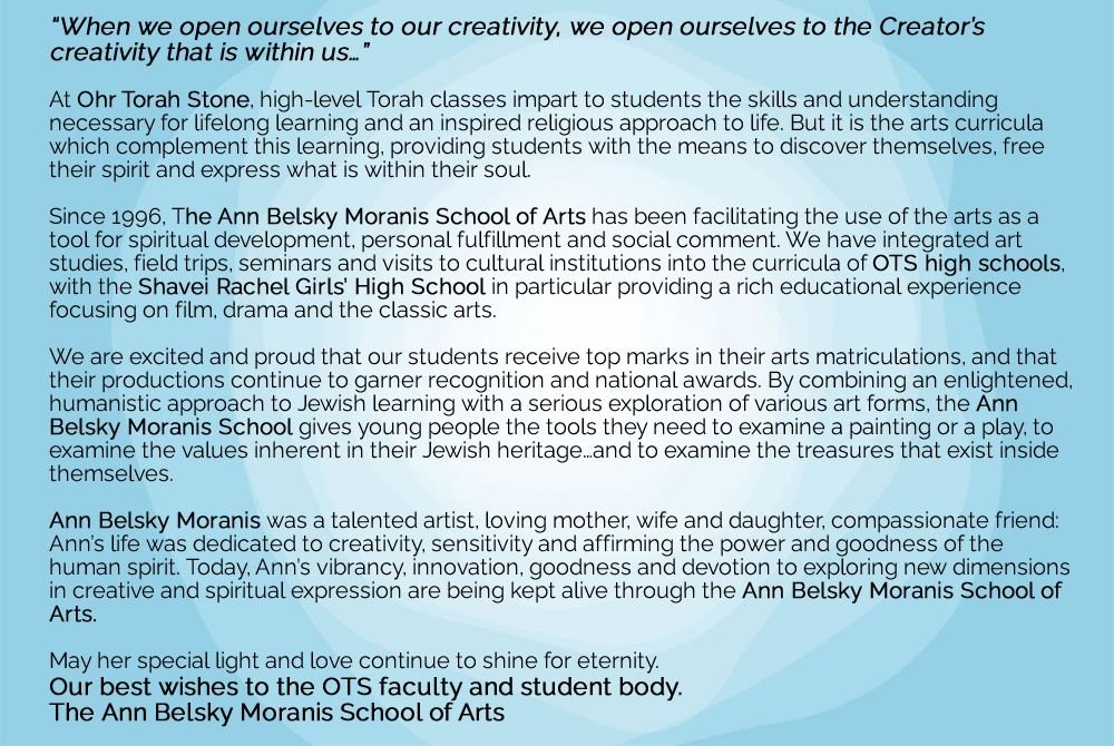 Jacob Sapirstein Junior High and High School for Boys, Ramot, Jerusalem Jennie Sapirstein Junior High and High School for Girls, Ramot, Jerusalem Neveh Channah High School for Girls, in memory of Anna Ehrman, Gush Etzion Neveh Shmuel Yeshiva High School for Boys, in memory of Samuel Pinchas Ehrman, Efrat Oriya Girls' High School, Gush Etzion Ann Belsky Moranis Program for Arts and Drama