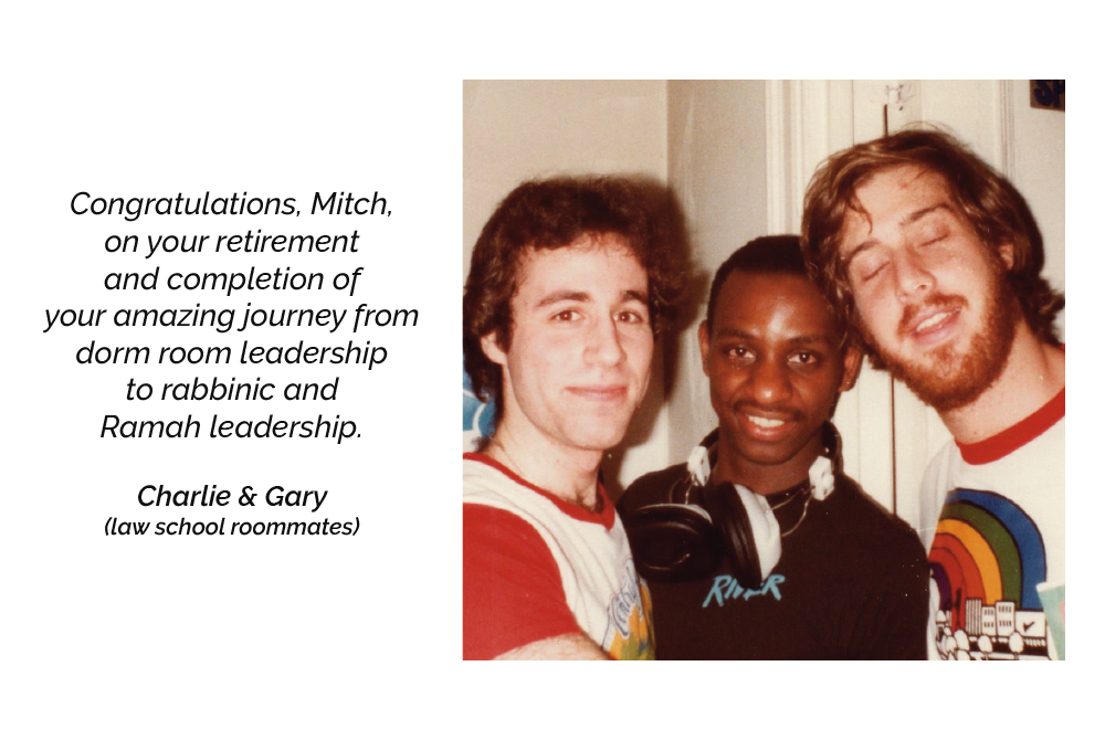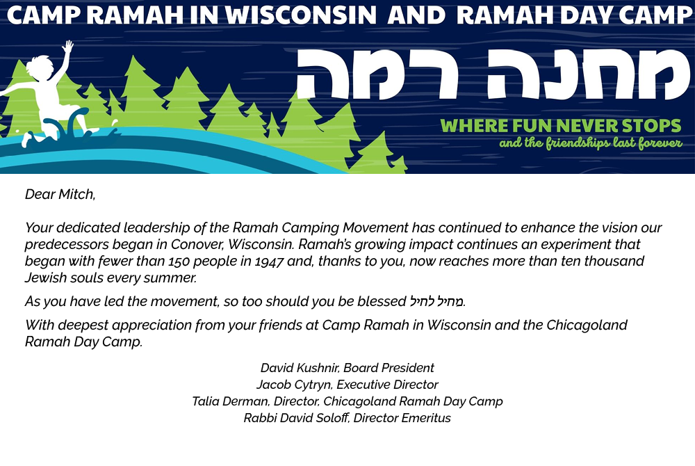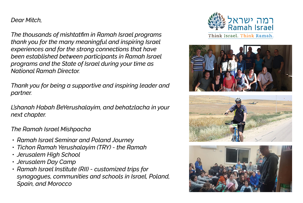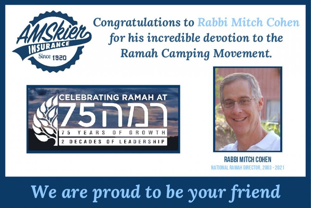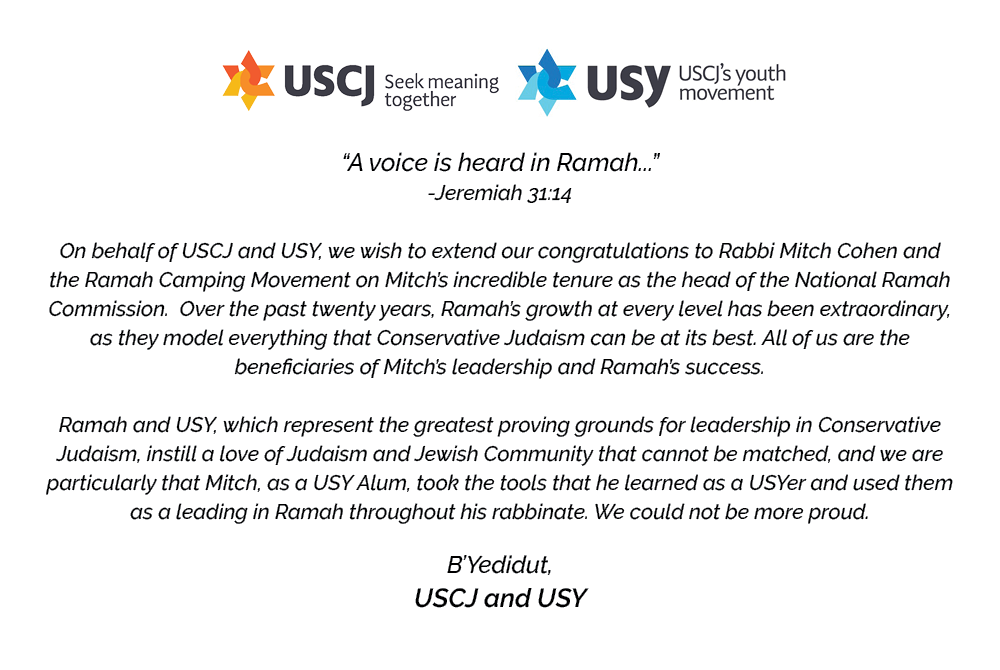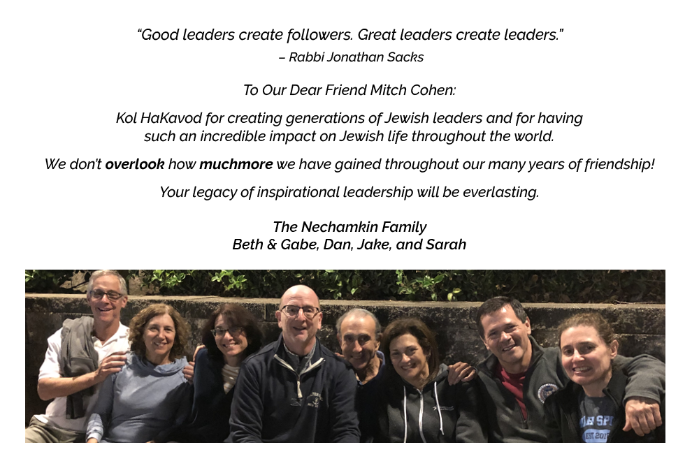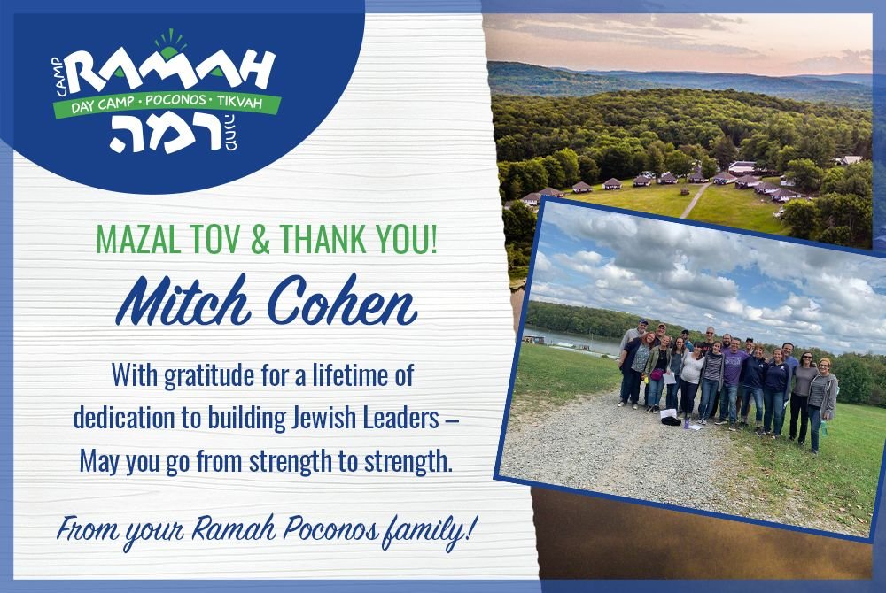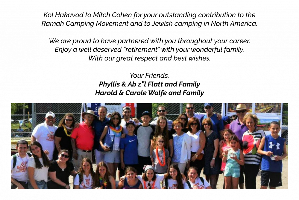 Kol HaKavod to Rabbi Mitch Cohen for two decades of inspirational leadership of the Ramah Camping Movement. Avi Friedman & Amy Goldstein