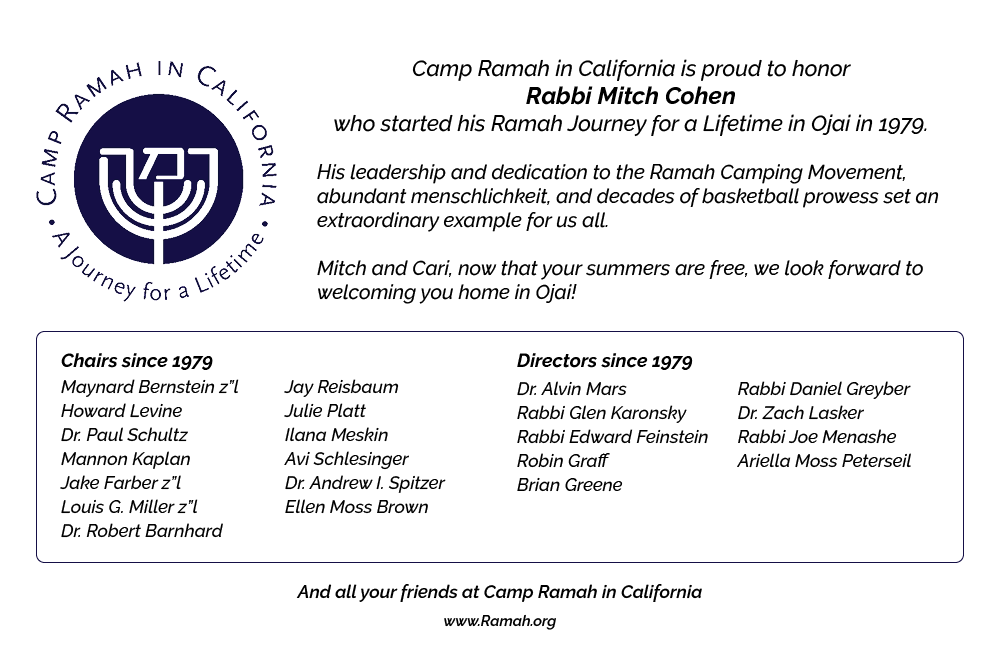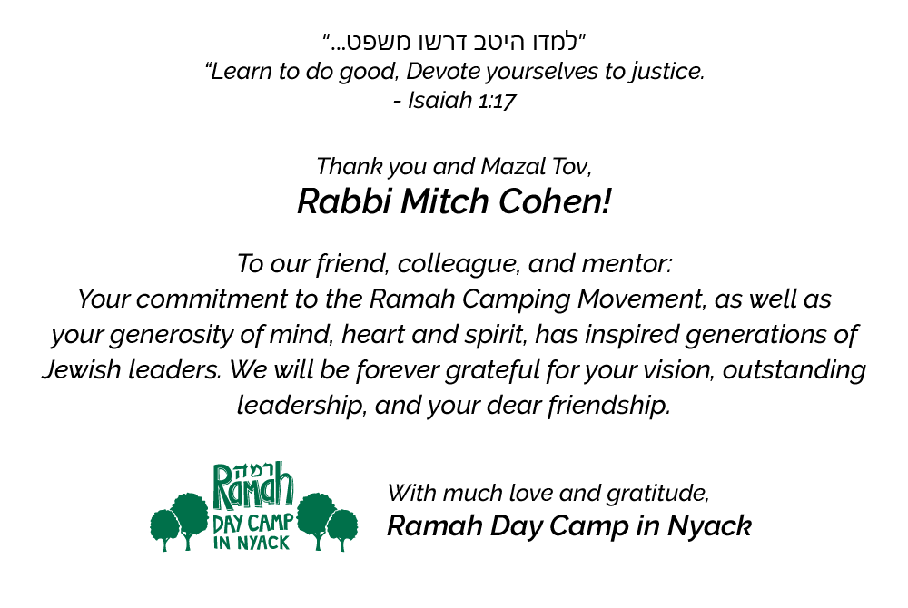 Kol HaKavod to Rabbi Mitch Cohen for two decades of inspirational leadership of the Ramah Camping Movement. Amy Legow & Lawrence Zola