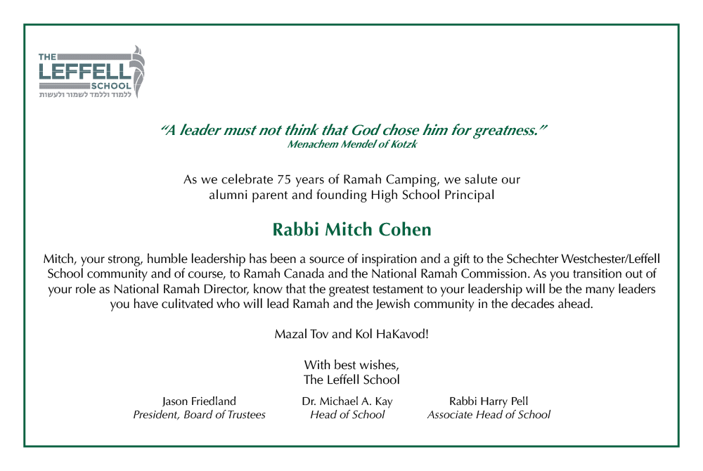 Kol haKavod to our haver haRav Menahem for two decades of inspirational leadership of our beloved Ramah Movement! - Nomi Shapiro & David Ackerman Kol Hakavod! - Rabbi Morris Allen & Dr. Phyllis Gorin Rabbi Cohen, thank you for all you have done for our camp and the Jewish people! - Ezra Balsam & Laura Elkayam Mazel Tov to Mitch from the Bodner Family. Alisa & Michael look forward to joining Mitch & Ramah in Israel in May! - The Bodner Family Mazal tov to Ramah for 75 years of growth and innovation and to Rabbi Mitch Cohen for two decades of inspirational leadership. - Meryl & Benjy Brown Thank you to Rabbi Mitch Cohen for inspiring, educating and impacting so many children. Kol HaKavod! - Deborah & Ari Burstein Kol HaKavod to Rabbi Mitch Cohen for two decades of inspirational leadership of the Ramah Camping Movement. - The Cherrin Family Mazal tov to Ramah for 75 years of transformative Jewish experiences for thousands of campers and staff members. - Judy Dvorak Gray Mazal tov to Ramah for 75 years of growth and innovation and to Rabbi Mitch Cohen for two decades of inspirational leadership. - Mindy & Myron Edelman Congrats to Mitch Cohen on incredible leadership and to Ramah-- a gift for 3 generations of Edelmans! - Rabbi Moshe Edelman Mazel Tov to Rabbi Mitch Cohen on his retirement and for helping to build the multi-generational community at Camp Ramah in Canada.- Roberta & David Feldman With admiration and gratitude for your many years of leadership and friendship. - Netta Zweig & Dan Goldberg Mazel tov to Ramah at 75 and to Rabbi Mitch Cohen for his inspiring leadership. - Lynne & Arnie Gordon Thank you, Rabbi Mitch Cohen, for making a difference. - Rabbi Michael & Cindy Greenbaum Mazal tov to Ramah for 75 years of growth and innovation and to Rabbi Mitch Cohen for two decades of inspirational leadership. - Joe & Amy Doberman Griminger Mitch, thank you for your dedicated service to Ramah and best wishes on your retirement. - The Gropper Family We are grateful to Machanei Ramah and Rabbi Mitch Cohen, who have deeply enriched our family. Kol HaKavod L'Kulam! - Rabbi Marc & Abbey Frank Israel Mazal tov to Ramah and Rabbi Mitch Cohen for his inspiring leadership, which has been evident since our time together in college. - Ric Kaner Thank you for your immeasurable and indelible contribution to Machaneh Ramah. - Lauren & Kenny Kanfer Kol HaKavod to Rabbi Mitch Cohen for two decades of inspirational leadership of the Ramah Camping Movement. - Ben Katz Todah Rabah to Rabbi Mitch Cohen for his tremendous leadership of the Ramah Camping Movement & Mazal Tov to all!! - Stuart & Marni Katz Mazal tov to Ramah for 75 years of growth and innovation and to Rabbi Mitch Cohen for two decades of inspirational leadership. - Gerry & Judy Kobell Mazal tov to Ramah and to Mitch Cohen. It's been wonderful working together. - Adena Lebeau & Jeff Kress Yashar Koach. All the best in your future endeavors. - Rabbi Vernon & Bryna Kurtz Kol HaKavod to Mitch, who has positively impacted generations of Chanichim, Tzevet, and lay leadership. Todah Rabah. - Bill & Robin Sue Landsburg In honor of Rabbi Mitch Cohen's retirement. - Ari Levin Mazal tov to Ramah for 75 years of growth and innovation and to Rabbi Mitch Cohen for two decades of inspirational leadership. - Barbara Meixler From strength to strength. Kol haKavod to Mitch. Yom Huledet Sameah to Ramah! - Billy Mencow & Amy Mates Kol HaKavod to Rabbi Mitch Cohen for two decades of inspirational leadership of the Ramah Camping Movement. - Rabbi Rafi Rank, Midway Jewish Center Mazal tov to Ramah for 75 years of growth and innovation and to Rabbi Mitch Cohen for two decades of inspirational leadership. - Craig & Jackie Miller Mazal tov Mitch! You've come a long way since the summer of 1970! - Scott Miller With gratitude for your leadership, guidance, wisdom and support. - Aviva Millstone Mazal tov to Ramah on 75 incredible years and to Rabbi Mitch Cohen for his inspiring leadership. - Irene Moff So happy to celebrate with Mitch TWO DECADES of Ramah leadership & FOUR DECADES of dear friendship! - Miriam Wolf & Dani Moskowitz Kol HaKavod to a great Ramah leader and incredible visionary whose creativity and wisdom will have a lasting impact. - Alissa Neil Kol HaKavod to Rabbi Mitch Cohen for two decades of inspirational leadership of the Ramah Camping Movement. - Cliff & Shula Nerwen Mitch I knew you when.... Mazel tov to you and to Ramah on its 75th! - Esther Netter Mitch, Thank you for your leadership, mentorship, and balance. Rov Todot! - Ron Polster and Family Mazal tov to Ramah for 75 years of growth and innovation and to Rabbi Mitch Cohen for two decades of inspirational leadership. - Bezalel Porten Ramah...here's to the next 75! It has been an honor and privilege for our family to learn, work, and grow with you. - Sharon Rappaport and Family Kol HaKavod to Rabbi Mitch Cohen for two decades of inspirational leadership of the Ramah Camping Movement. - Sandy & Arlene Remz Mazal tov to Ramah for 75 years of growth and to Rabbi Mitch Cohen for his inspiring leadership - Rabbi Carnie & Paulie Rose and Family Kol Hakavod to Rabbi Mitch Cohen for your outstanding leadership and inspiring future generations! - Renana & Bob Rosenbloom Kol Hakavod to Rabbi Mitch Cohen on his many decades of dedication and leadership, and Mazel Tov to Ramah on its 75th! - Sharon & Rabbi Michael Safra Mazal tov, Mitch. It was an honor to work with you and learn from you. Ramah was lucky to have you! With gratitude and love, Nadine Sasson Cohen Mazal Tov, Rabbi Mitch Cohen, on your past achievements and all the best in your future endeavors. - Josh Schraeter Mazal tov to Ramah for 75 successful years and to Rabbi Mitch Cohen for his inspiring leadership - Yael & Mark Shayne Mazal tov to Ramah for 75 years of growth and innovation and to Rabbi Mitch Cohen for two decades of inspirational leadership. - Susan Smith Congratulations to Mitch for your years of service and congratulations to Ramah