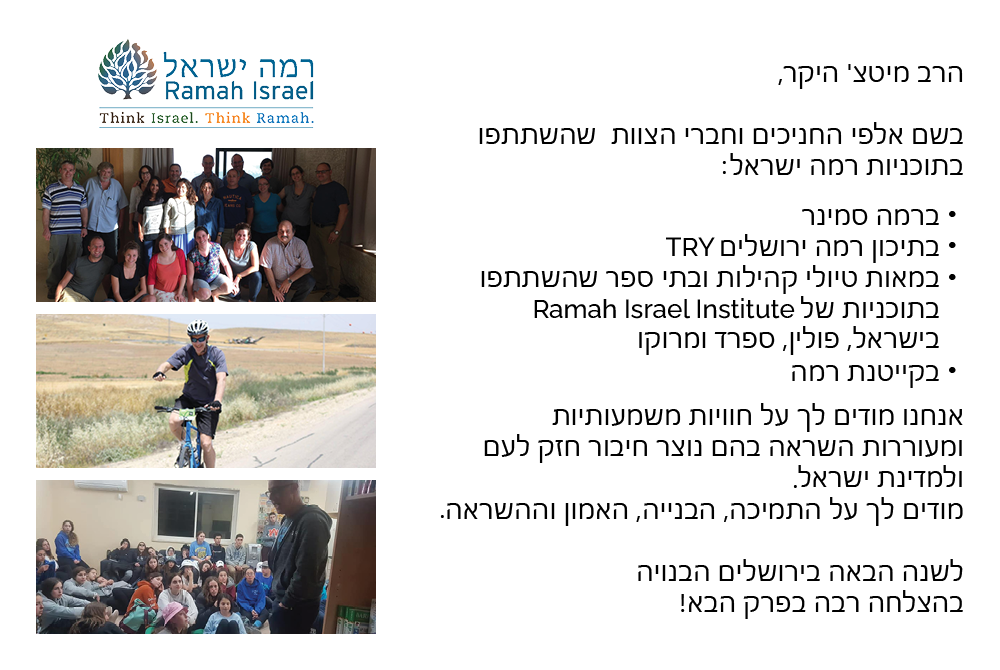 Personal best wishes and Mazal Tov to Rabbi Mitch Cohen, whose leadership has brought Ramah to new heights of growth and achievement. Rabbi Al Thaler