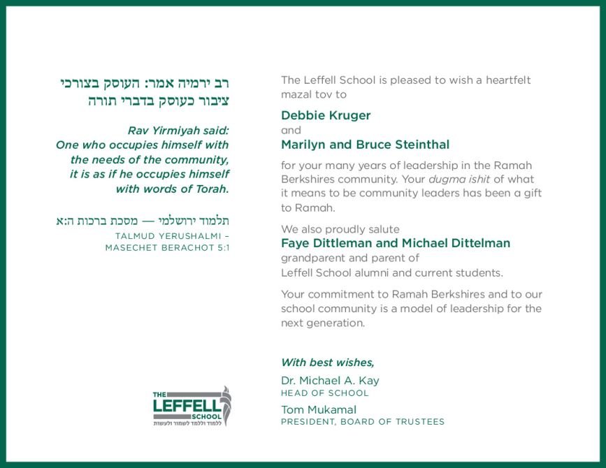 Mazal Tov to Marilyn & Bruce Steinthal and Faye Dittelman / Michael Dittelman on this well deserved honor! We are grateful for all you do to support and strengthen Camp Ramah in the Berkshires and our alumni community. Debbie Kruger, Robby Tepper and Eden Tepper
