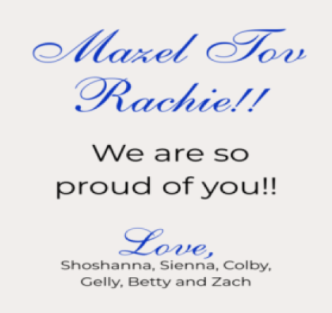 Dear Rachie, we are so proud of you for everything you do to elevate Jewish spirit and strength. Mazal Tov! Jordana, Andrew, Aliza, Ben Fruchters + Howards