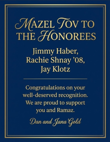 Mazel Tov to all the honorees on this well-deserved honor. Your commitment to The Ramaz School is so appreciated. Josh and Liron Goldberg, Azencut LlC