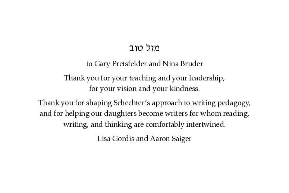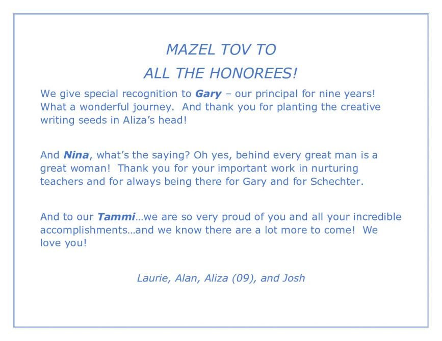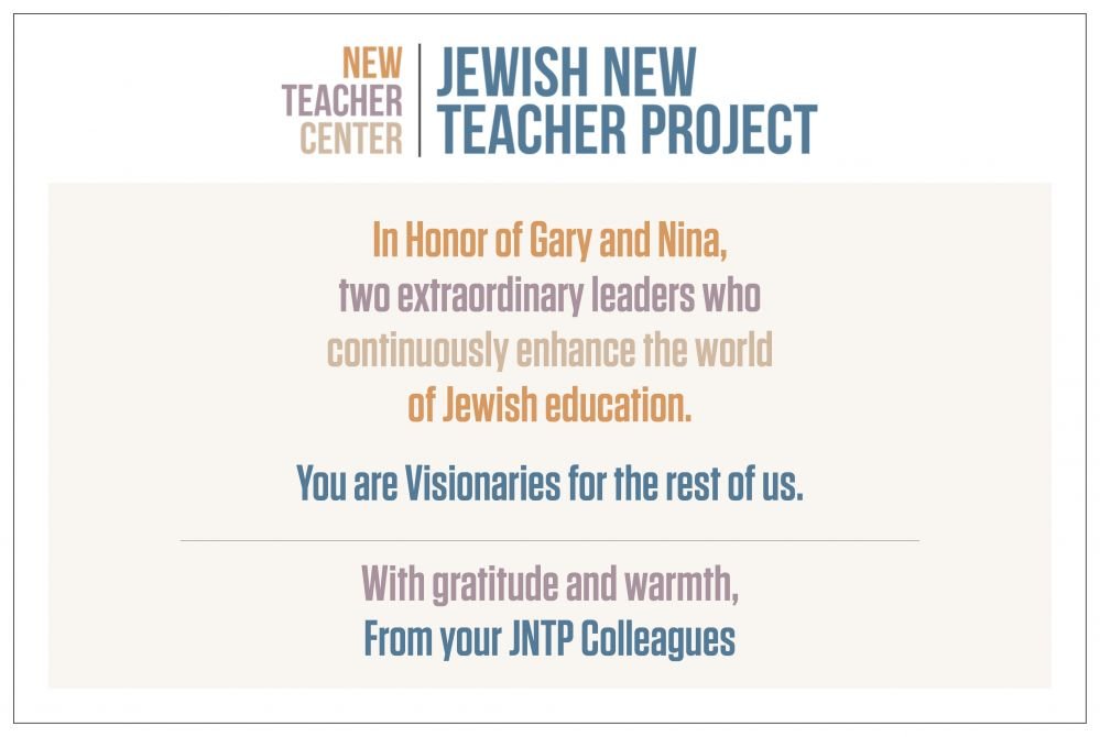 Mazal tov to Gary Pretsfelder and Nina Bruder for making a profound difference in the lives of countless teachers and students and inspiring us all. Sharon Cohen Anisfeld and Shimon Anisfeld