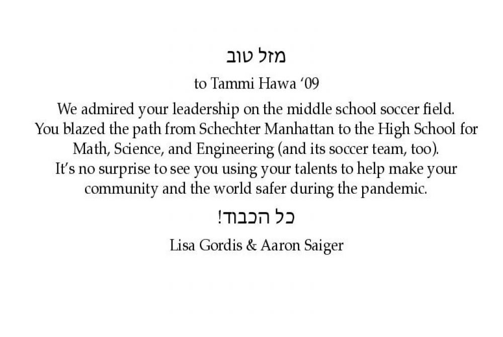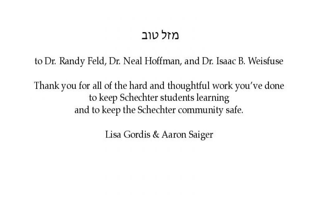 Thank you to Schechter Manhattan for nurturing Hannah and Shai and providing them with a wonderful comprehensive education! Susan and Philip Rabin
