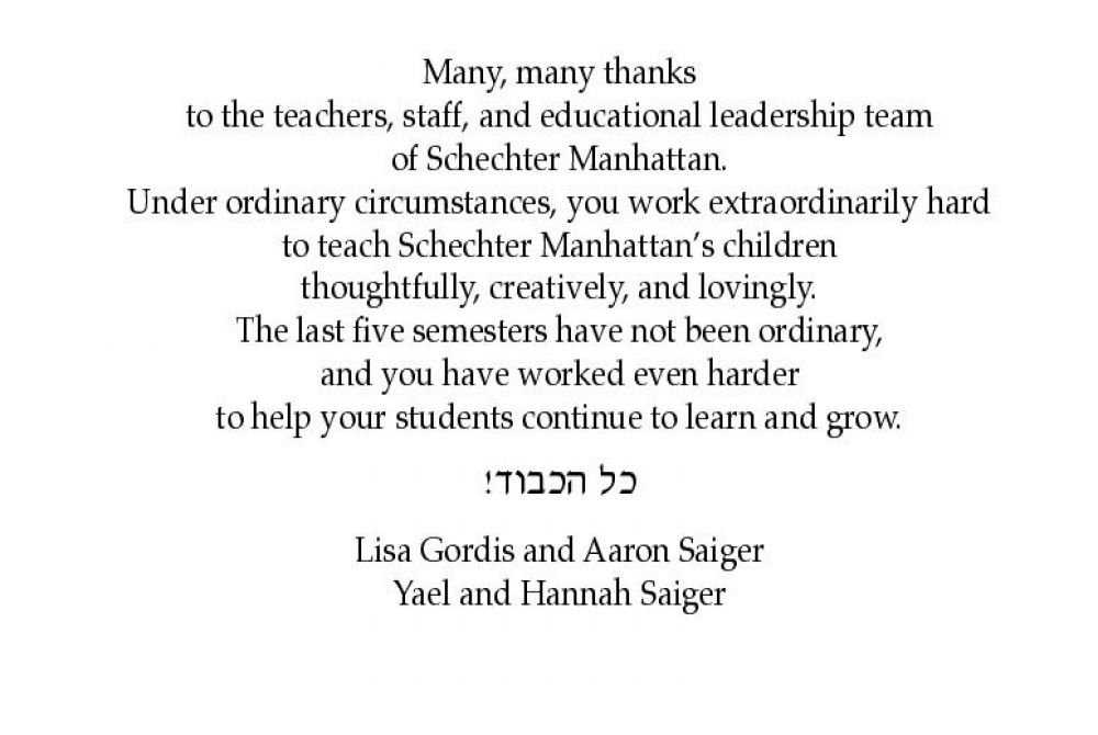 Thank you for all that you do to make Schechter Manhattan a special place to teach and learn.