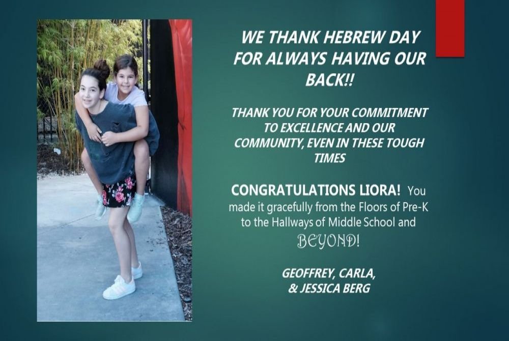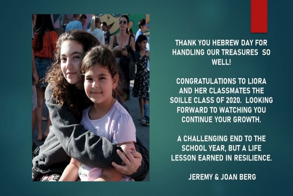 Congratulations to our grandson, Aiden Lerner! Who is successfully completing his first year in Middle School. We are so proud of you! You are loved, unconditionally. Safta Toni and Grandpa Allen We are proud to be part of the Soille Hebrew Day School, where children are provided with a strong Jewish foundation in a warm, nurturing and inspiring atmosphere to learn and grow. The Hermel Family Chaverim I