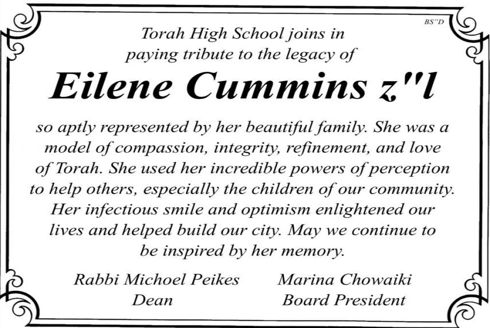 In memory of Eilene Cummins (z"l) and her contribution to the Jewish community and years of dedication at Beth Jacob Congregation. Success to Soille Hebrew Day School's future. Rabbi Avram & Leah Bogopulsky Congratulations to Soille Hebrew Day for making a difference in the community. Naomi and Rabbi Yoni Danzger Congratulations to the SSDHDS for making a difference not only in our community but to the entire Jewish world. From Rabbi Chaim and Temi Hollander and the Hollander Alumni of the Day School Quarter Page