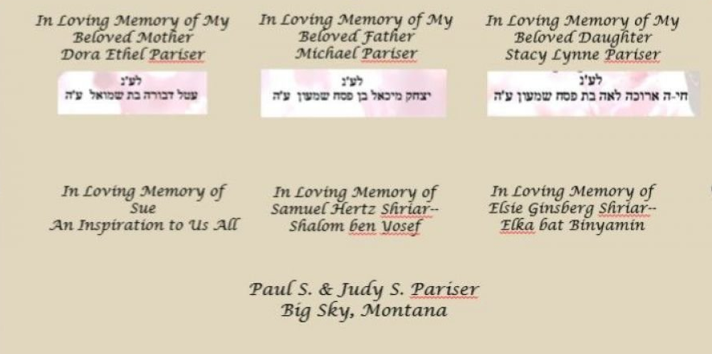 In loving memory of Eilene Cummins Arielle and Jacob Lewis The future is through the children! In honor of our children, Malka and Yisroel Weiser and grandchildren, Yael, Menachem, Nava and Asher! Love, Savta and Saba Chaverim I