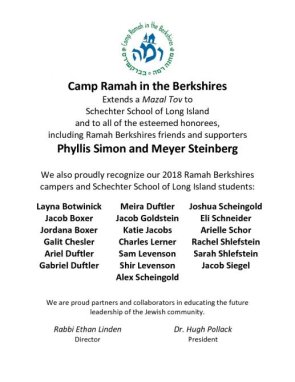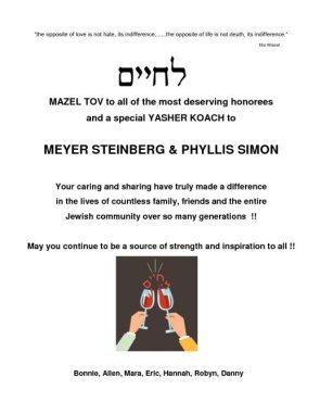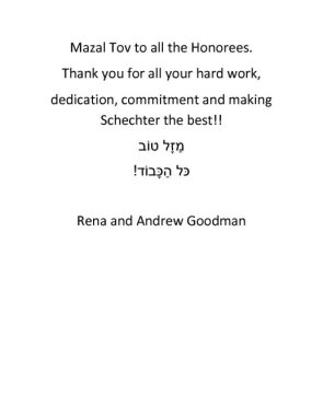 You both set such wonderful examples for your children with your leadership, commitment and generosity to Schechter and the Jewish community. We are grateful and proud to call you our dearest friends. We look forward to sharing many more simchas together.