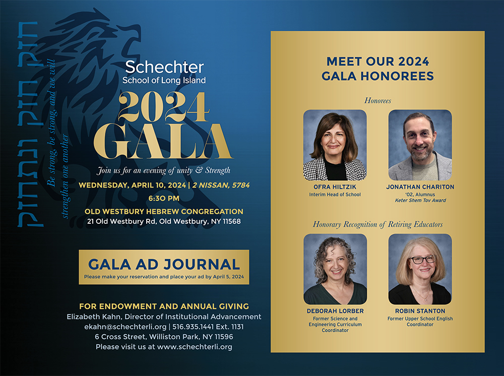 For generations, the phrase “Chazak, Chazak, V’Nitchazek” (be strong, be strong, and we will strengthen one another) has served as a rallying cry for the Jewish community and as a direct connection to the Torah. At the Schechter School of Long Island, we understand that developing strong Jewish identities is the key to the future of the Jewish People. With this in mind, we are proud this year to honor members of our community who have demonstrated a true commitment to Jewish education and to our children, and thereby to the strength of the Am Yisrael. Each of our honorees represents the best of what the Schechter community has to offer.