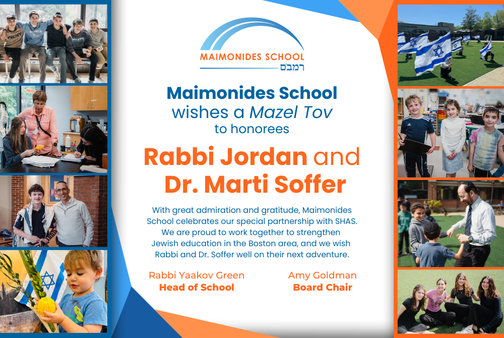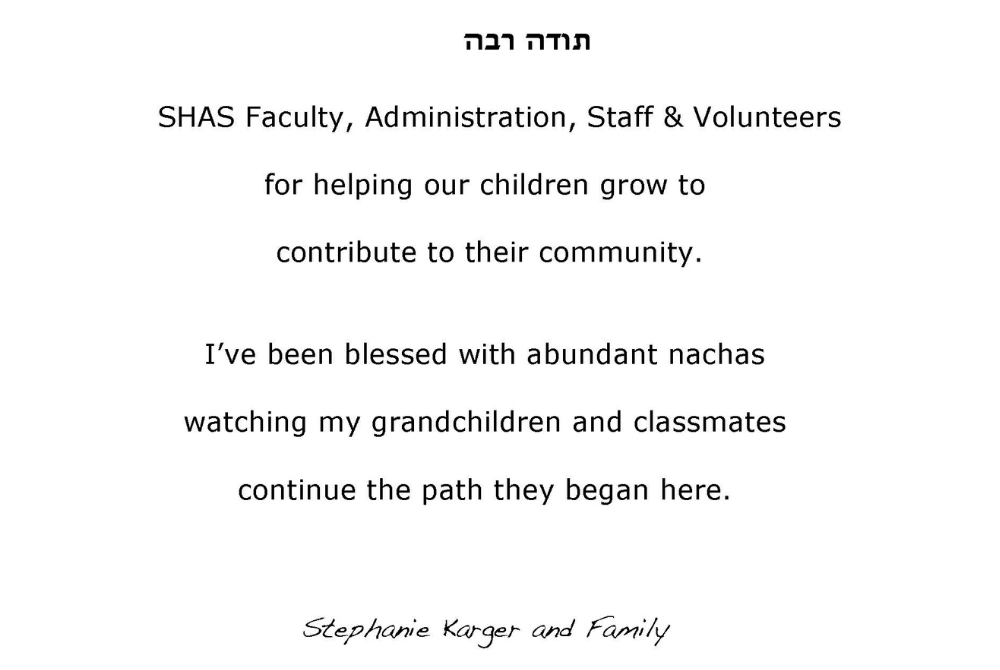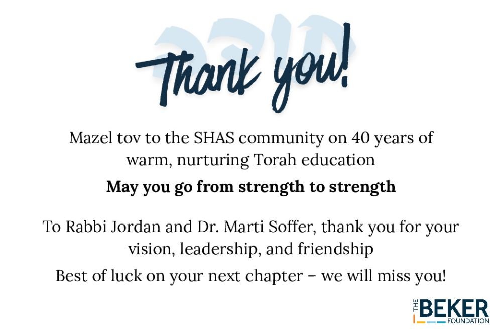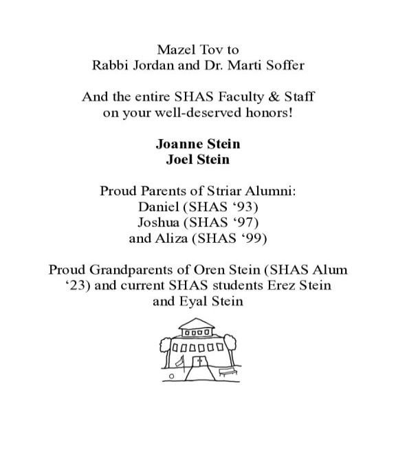 Thank you to Rabbi Jordan and Dr. Marti Soffer for all you have done to create the excellent school SHAS is today. Heather and John Rosenthal