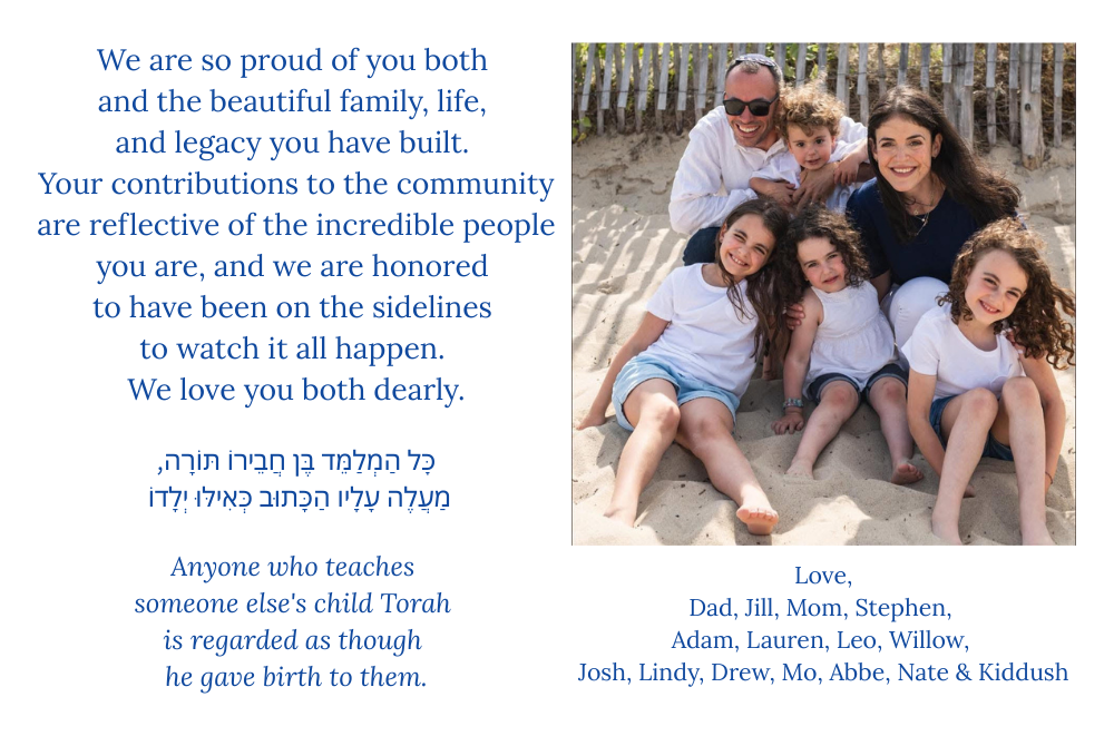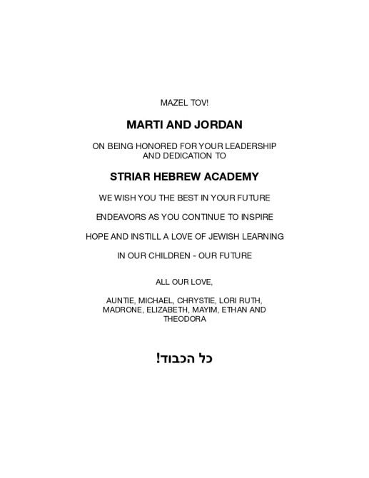 Mazal Tov to Rabbi Jordan and Dr. Marti Soffer on their well-deserved honor. Your commitment to Striar Hebrew Academy is so appreciated. Danny and Ella Kaufman