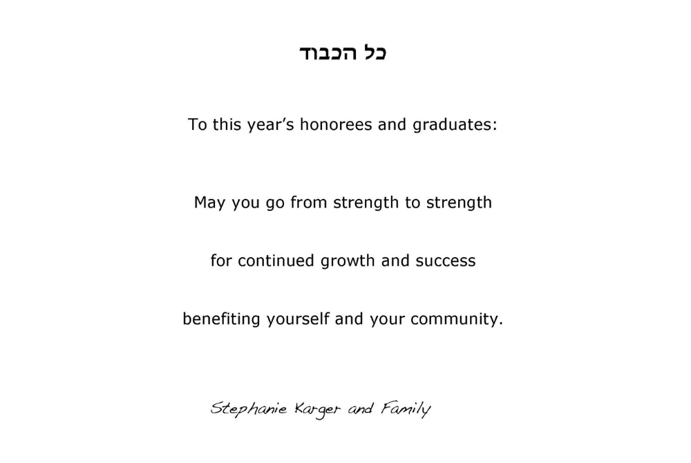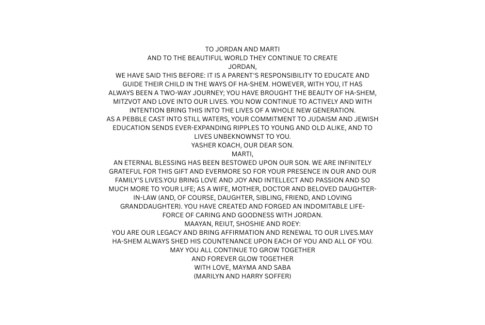 Mazal Tov to Rabbi Jordan and Dr. Marti Soffer on your well-deserved honor. Stephanie and Moshe Kaplan and Family Mazal tov to the graduates! And a huge thank you to Rabbi Soffer and Marti, we will miss you and your family! Masha and Yonatan Keschner