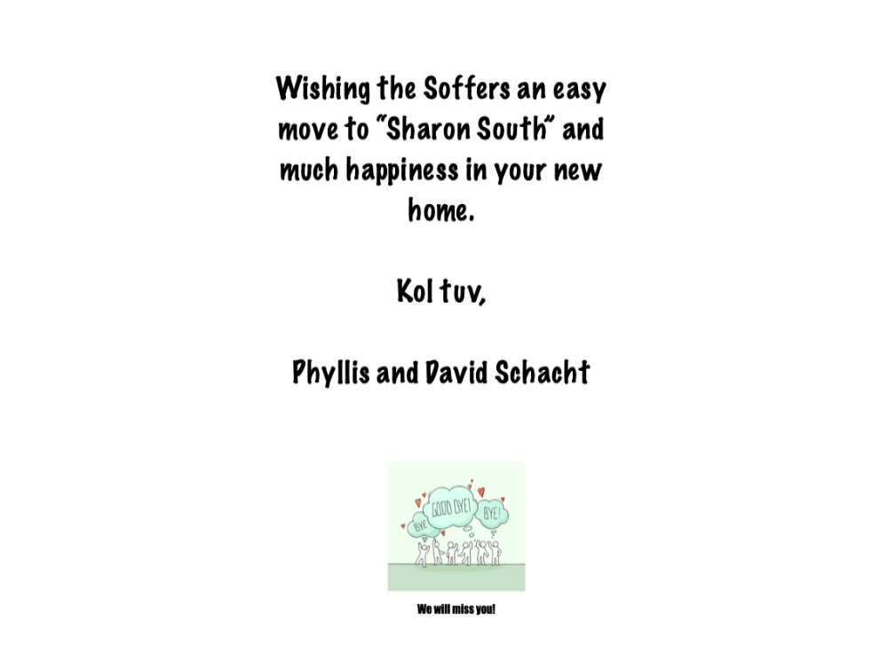 Thank you Rabbi Soffer for all that you have done to build SHAS and the Jewish community in Sharon. You will be greatly missed! Mitch & Miriam Klausner