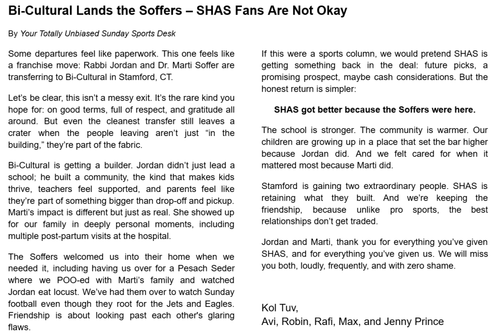 Words cannot express our gratitude. It has been an honor and a pleasure! B'hatzlacha, Josh, Kayla, Shai and Ollie Bellin Thank you Rabbi Soffer & Marti for all you have done for SHAS and the community! You've led SHAS with professionalism, kindness and an impressive football-throwing arm. You will be greatly missed! Jon & Tali Glanzman Third Page