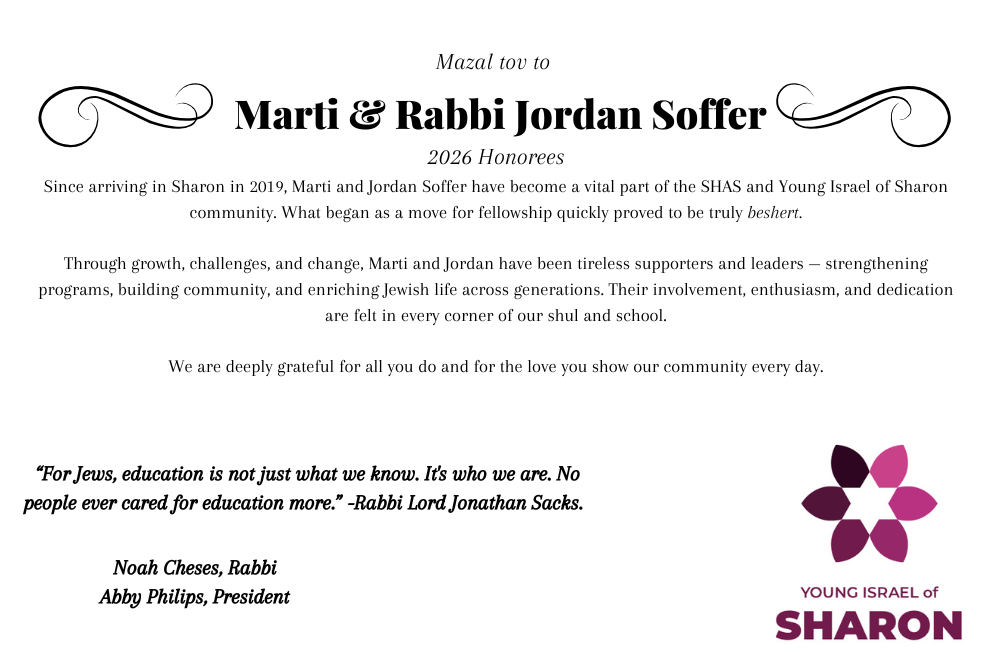 Rabbi Soffer and Marti, Your steady and thoughtful leadership has left an indelible mark on SHAS, Sharon and the Boston Jewish community. Mazal tov & hatzlacha! Aryeh Feder and Rachel Levine and Family