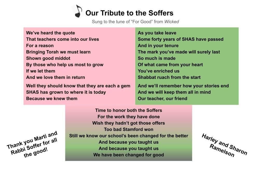 Mazal tov, yasher koach, and todah rabah to the Soffers - and to the the entire SHAS staff! Soffers, you will be sorely missed... Naomi Korn Gold & Becca & Aryeh Gold