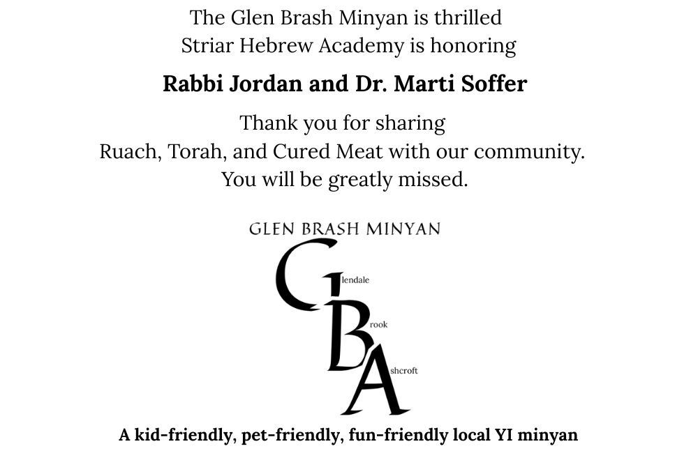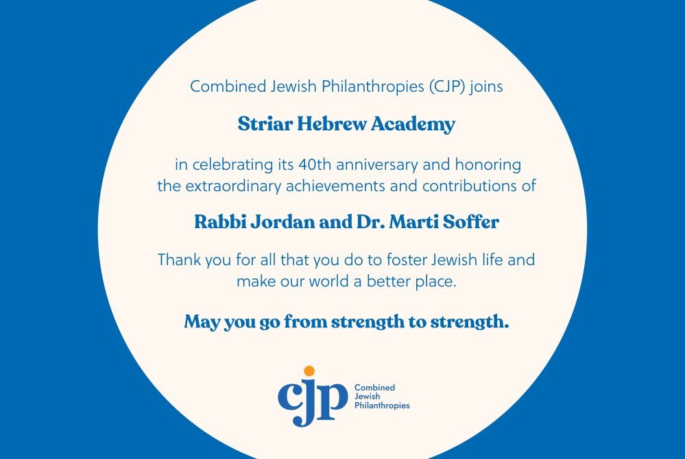 Mazal Tov to Rabbi Jordan and Dr. Marti Soffer on their well-deserved honor. Your commitment to Striar Hebrew Academy is so appreciated. Josh and Debbie Buchman