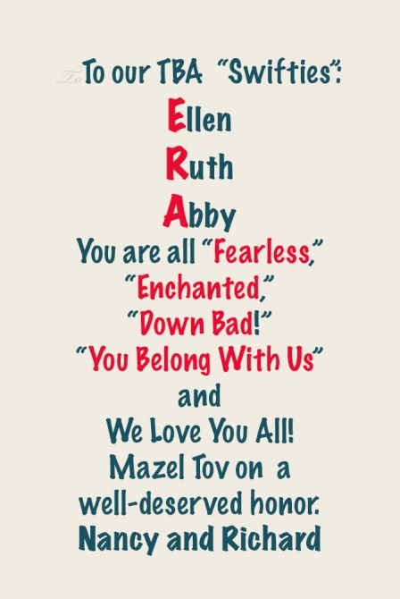 Mazal Tov Ellen, Ruth, and Abby, Thank you for all you do for TBA. It has been a pleasure to work with you all these years. Erica and Bryce Facktor