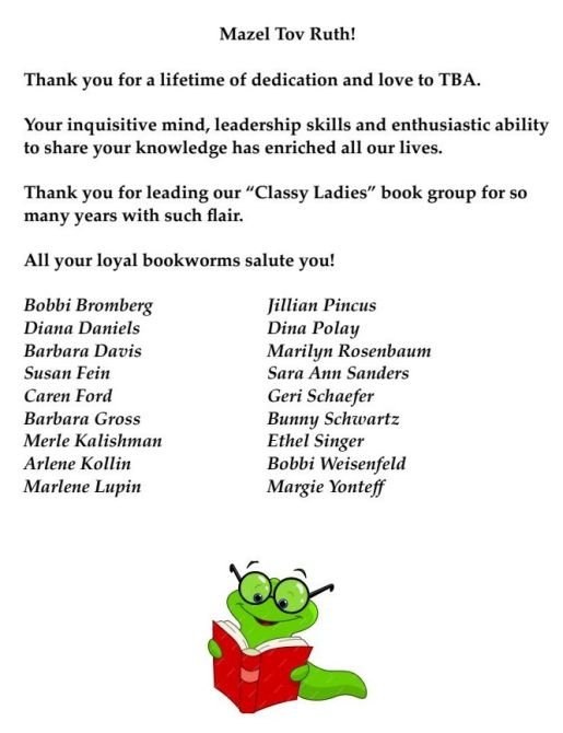 Thank you to our wonderful honorees. Your dedication to TBA shines through in all you do. We love you, Aunt Ruth. Joni and Alan Cohen
