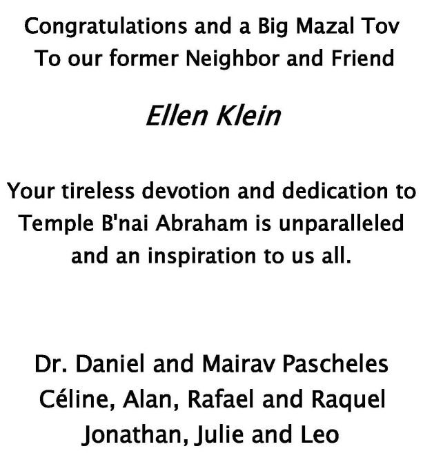 Ellen, Ruth, and Abby, Thank you for your tireless efforts through the years. You have helped to make Temple B'nai Abraham the welcoming spiritual home that it is. With love, Eileen & Jeffrey Klein