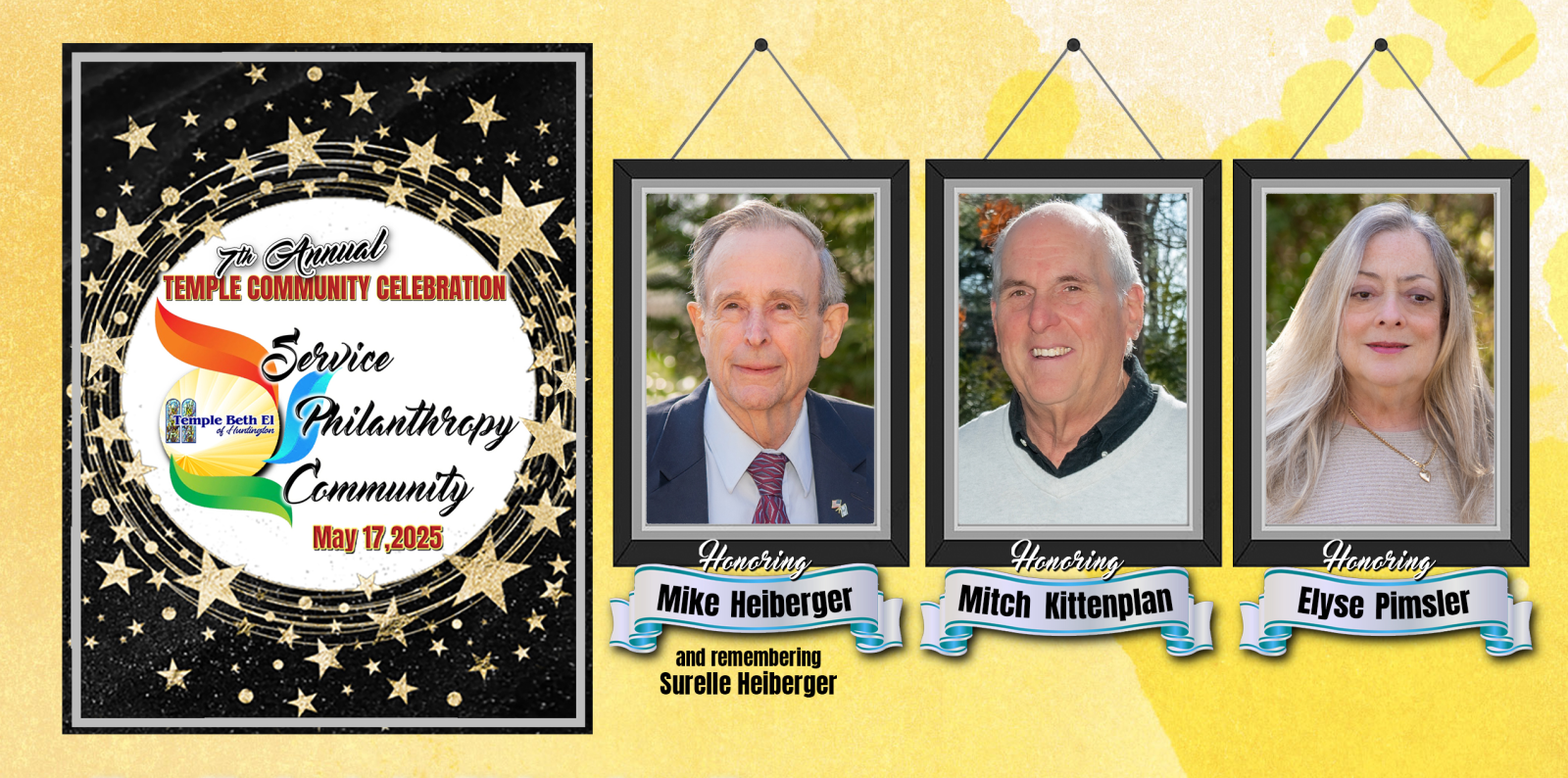The theme for this year's celebration is SERVICE • PHILANTHROPY • COMMUNITY. We are honoring Mike Heiberger, Mitch Kittenplan, and Elyse Pimsler for their many years of dedicated service to our congregation.
