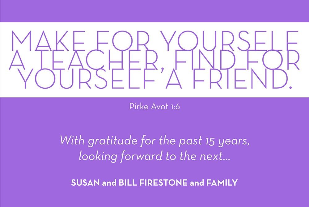 running the risk of feeling and leaving an impact on people brings happiness ".... Rabbi Harold Kushner Thank you for being our Rabbi, spiritual leader, and jewish educator for the last 15 years! Susanne and Bob Osofsky Gold
