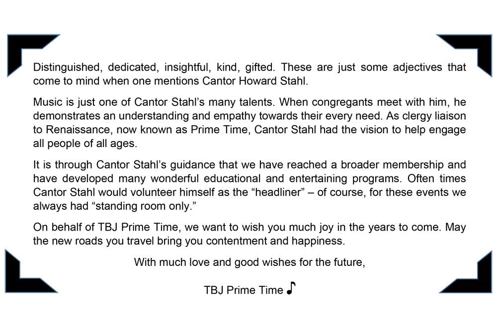 In honor of Cantor Stahl The Brotherhood would like to thank you