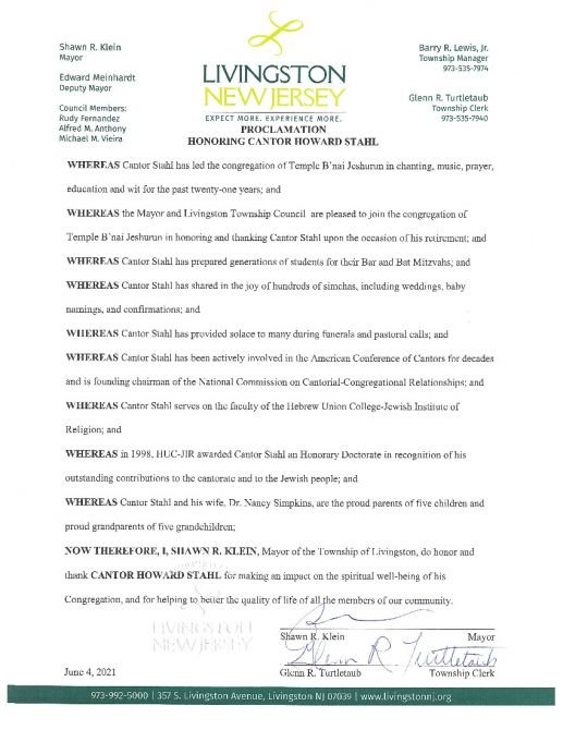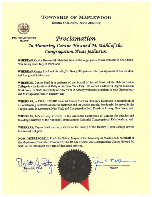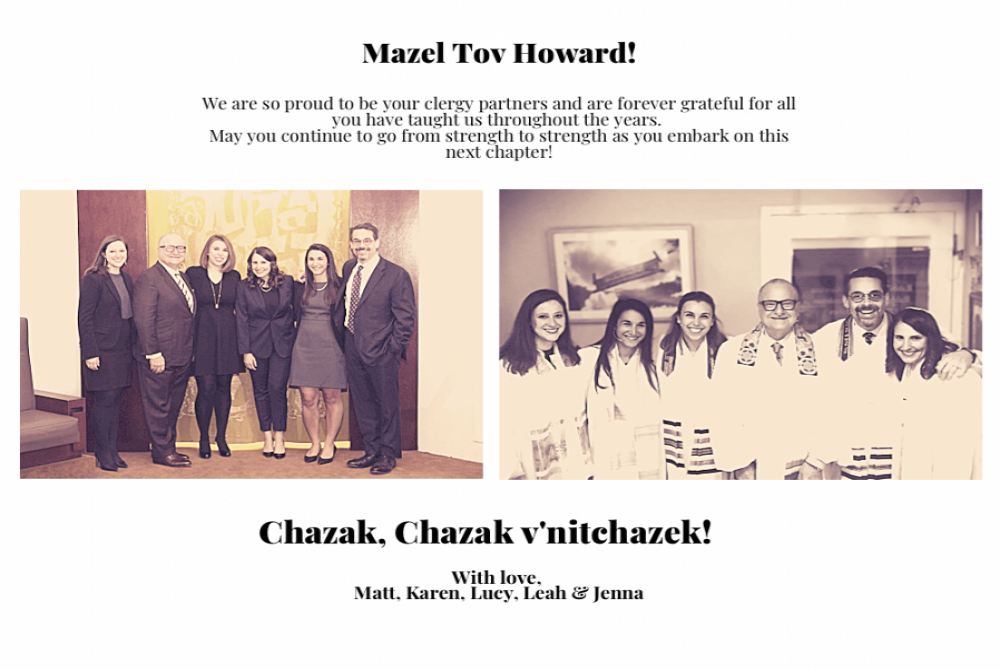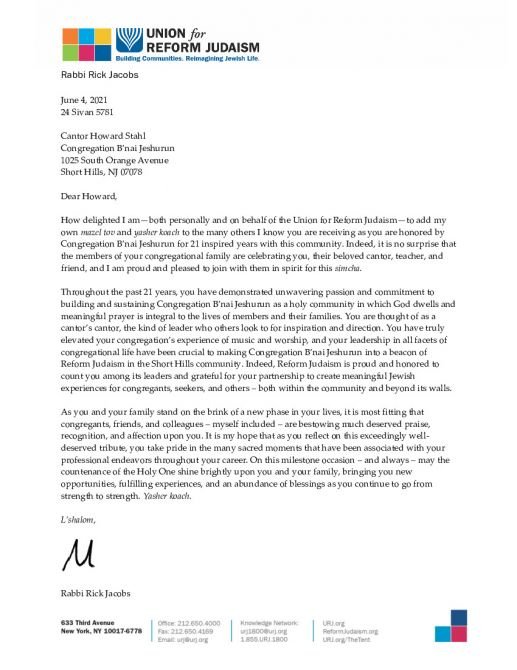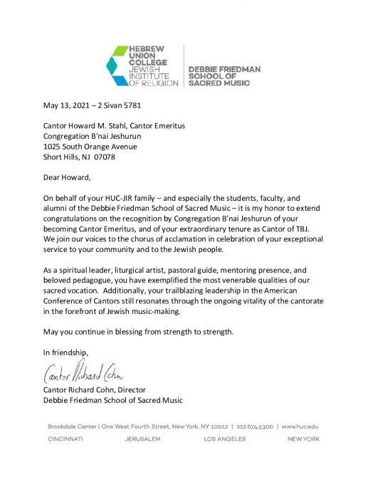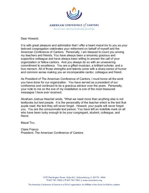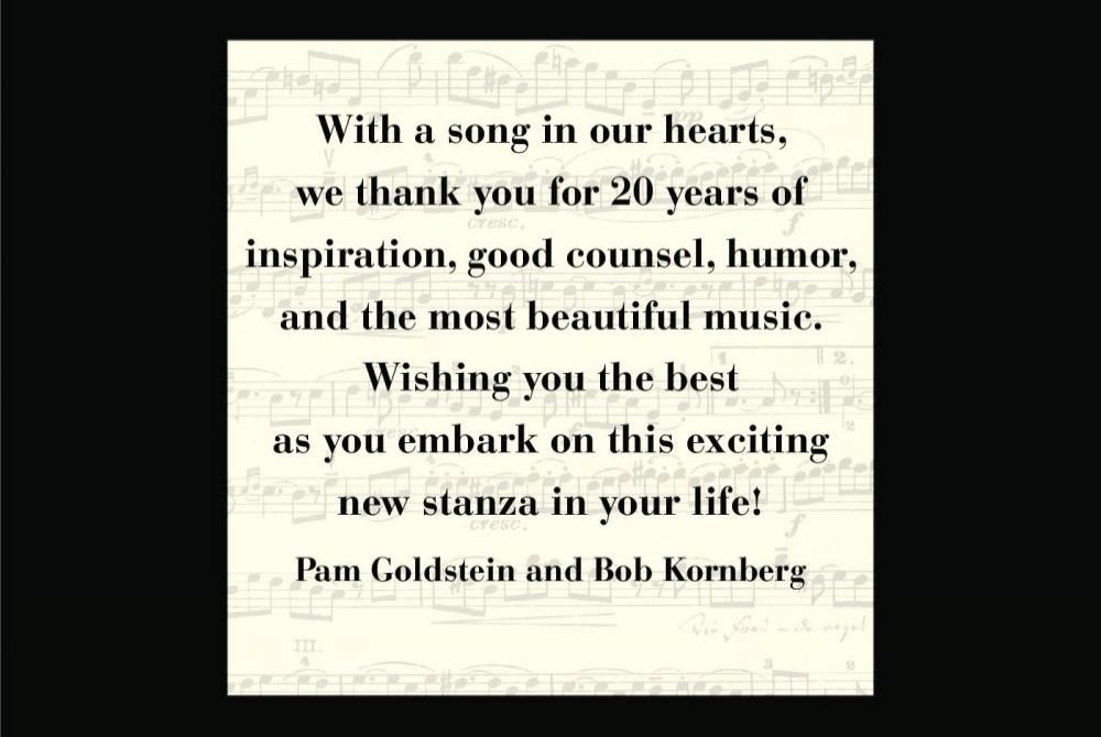 Thank you for the music, for your wisdom and elegance, for the laughter and learning, for your love of the cantorate and of the community, for your constant dedication to excellence and equanimity, and, above all, for your trust and loyal friendship. You have left an indelible mark on our lives, for which we are