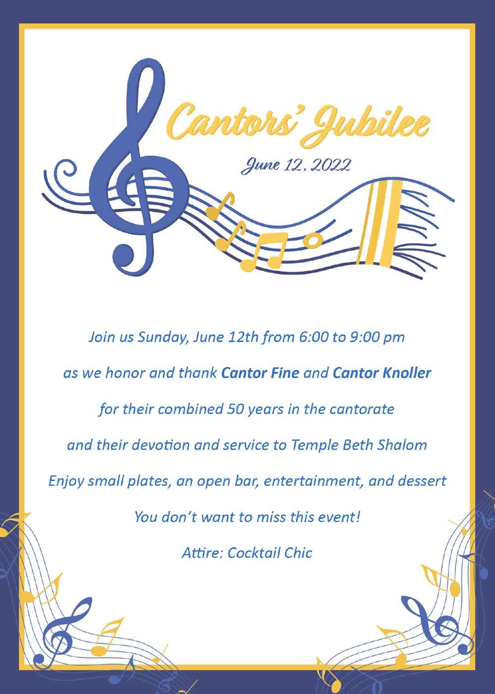 Join us Sunday, June 12th from 6:00 to 9:00 pm as we honor and thank Cantor Fine and Cantor Knoller