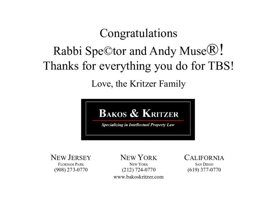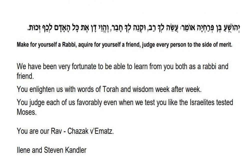 Thank you for all the years of sharing simchas and sadness, sermons and songs, the spiritual, the serious, the silly and the sweet. We respect what you mean to our community, value what you mean to our family, and treasure what you mean to US. Mazal Tov on earning your Doctorate of Divinty Kol Hakavod on 15 years of dedication to and leadership of TBS With love and friendship, Ilene and Jeffrey Craig & Marcia Grosswald