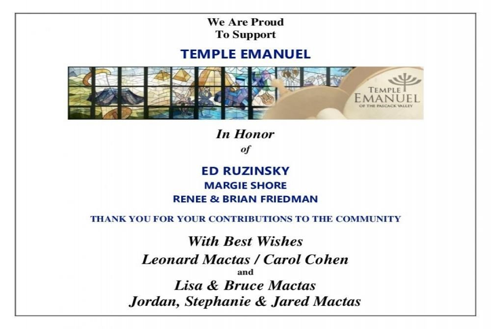 Without our honorees & their example of leadership & generosity, we would not be the first-rate center of Jewish life and education in the Pascack & Saddle River Valleys that we are. I thank you for joining us tonight as we recognize our STARS, & their invaluable contributions to both the legacy & future of Temple Emanuel. Thank you for your participation in the Tribute Journal which will provide our honorees with lasting memories of our appreciation for all they have done & will continue to do for our community.