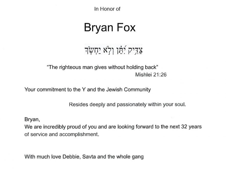 In honor of Bryan Fox in appreciation for his decades of dedicated service to our community. In recognition of the Class of 1993, their rebbi, Rabbi Parnes, and - among his hundreds of beloved talmidim - ארי בן יוסף ז"ל.