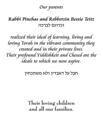 | 'IF ONES WISDOM EXCEEDS HIS DEEDS, HE'S LIKE A TREE WHOSE LEAVES ARE MANY, BUT WHOSE ROOTS ARE WEAK. A WIND MAY COME AND UPROOT IT. HOWEVER, IF ONES DEEDS EXCEED HIS WISDOM, HE IS LIKE A TREE WITH DEEP ROOTS AND FEW LEAVES., (PIRKAY AVOS, 3,17). TO RAV P.M. Z'TL & RAV E.M.,SHLITA FOR TEACHING US THE IMPORTANCE OF APPLYING OUR LEARNING. |