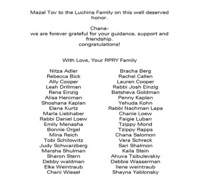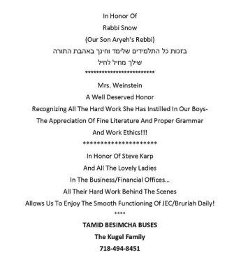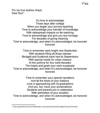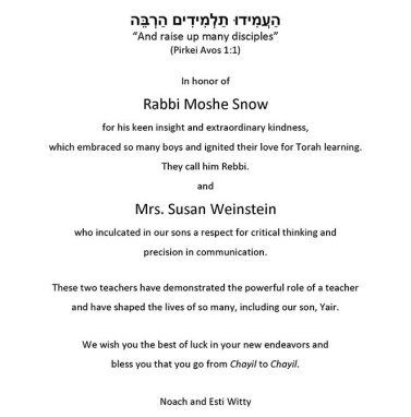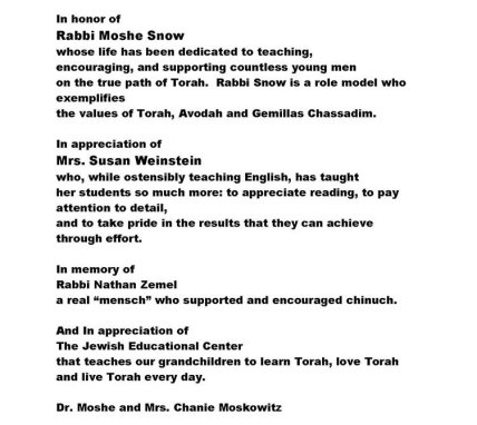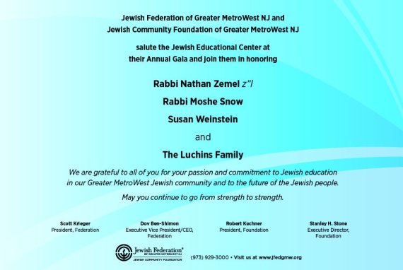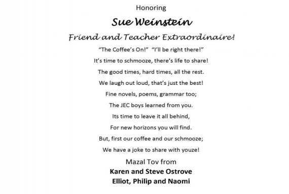 on receiving the prestigious JEC Laureate award, which you so richly deserve. We are sure that, as the honored teacher with a sunny disposition, witty personality and a no-nonsense classroom demeanor, your students were motivated to achieve their full potential. May HaShem grant you