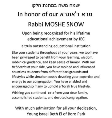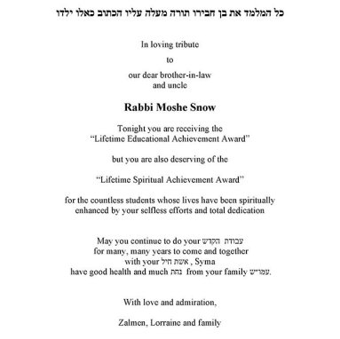 Mazel Tov to Rabbi Moshe Snow on receiving the Lifetime Achievement award, which you most definitely earned. You were truly