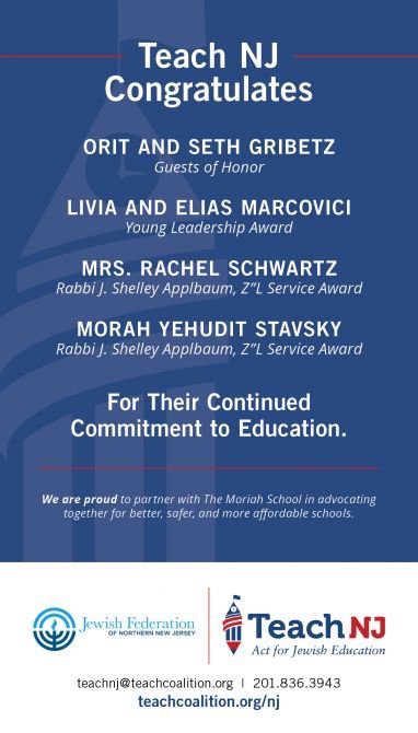 Congratulations to the Recipients of the Young Leadership Award Livia and Elias Marcovici For your loving commitment to the future development of our school. A hearty Yasher Koach to Mrs. Rachel Schwartz We are so fortunate that our children had an opportunity to learn from you.
