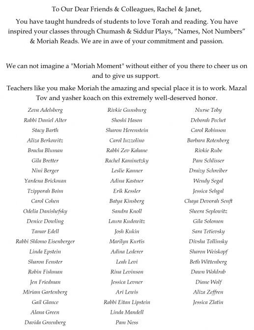 We are so glad that Moriah chose to honor such special teachers Rachel Schwartz and Janet Stavsky - you set the bar. We feel so blessed