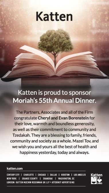 Mazal Tov to our friends who are family, Cheryl & Evan Borenstein Your commitment to Moriah, to our local community and the Jewish community at large is admirable. We are truly blessed to have you in our lives for 40 years! We can not imagine a more deserving couple. Your dedication is a constant source of inspiration to us all! We love you and wish you many more years of continuing to inspire your friends and family with your philanthropic work and hearts of gold! Ayelet & Brian Rosen, you are incredible role models to our community with your dedication and passion that you put into Moriah and so many other Jewish causes and organizations. It is an honor and a pleasure to call you our friends and share our involvement with you on so many of these causes that we hold dear! Tizku L'Mitzvot! Rachel Tkatch, your unwavering support of Moriah and so many local and community institutions are a testimony to the special person that you are. All that you do behind the scenes does not go unnoticed! We are so glad that Moriah chose to honor such special teachers Robin Fishman and Sara Weiskopf - We feel so blessed that our children have experienced your enthusiasm and love of learning. May you all go from strength to strength! Lisa & Jonathan Schechter