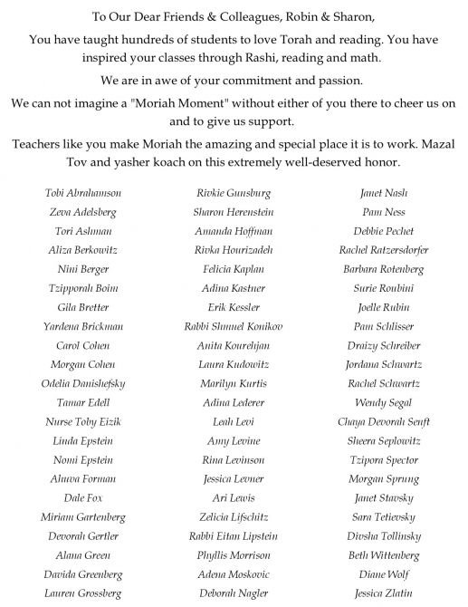 Mazel Tov to Robin and Morah Sara. My four children have all been beneficiaries of your diligence and teachings throughout the years. We salute your dedication and wish you Mazel