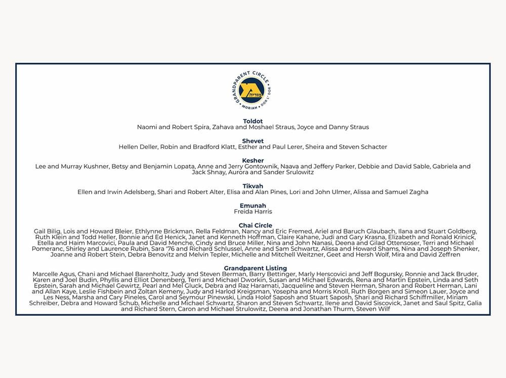 Steven & Daniele Bleier -Your dedication to Moriah and to the Jewish community at large is truly admirable. The generosity, vision, and heart you bring to every endeavor strengthen our community in immeasurable ways. Your leadership is matched only by your humility and genuine care for others. We are so proud of all that you have accomplished and so deeply grateful to call you our "framily."